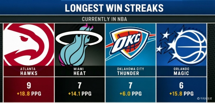 联盟目前最长连胜数:老鹰9连胜 热火&雷霆7连胜 魔术6连胜